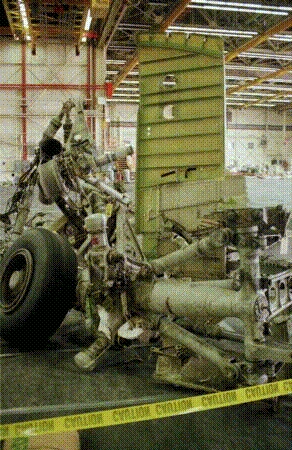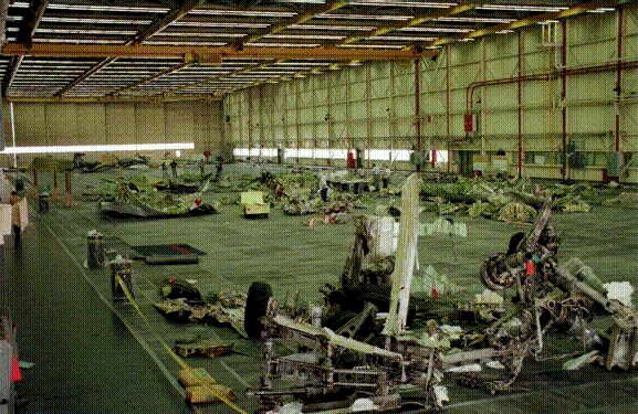 Les débris de l'avion sont rassemblés dans un hangar dont