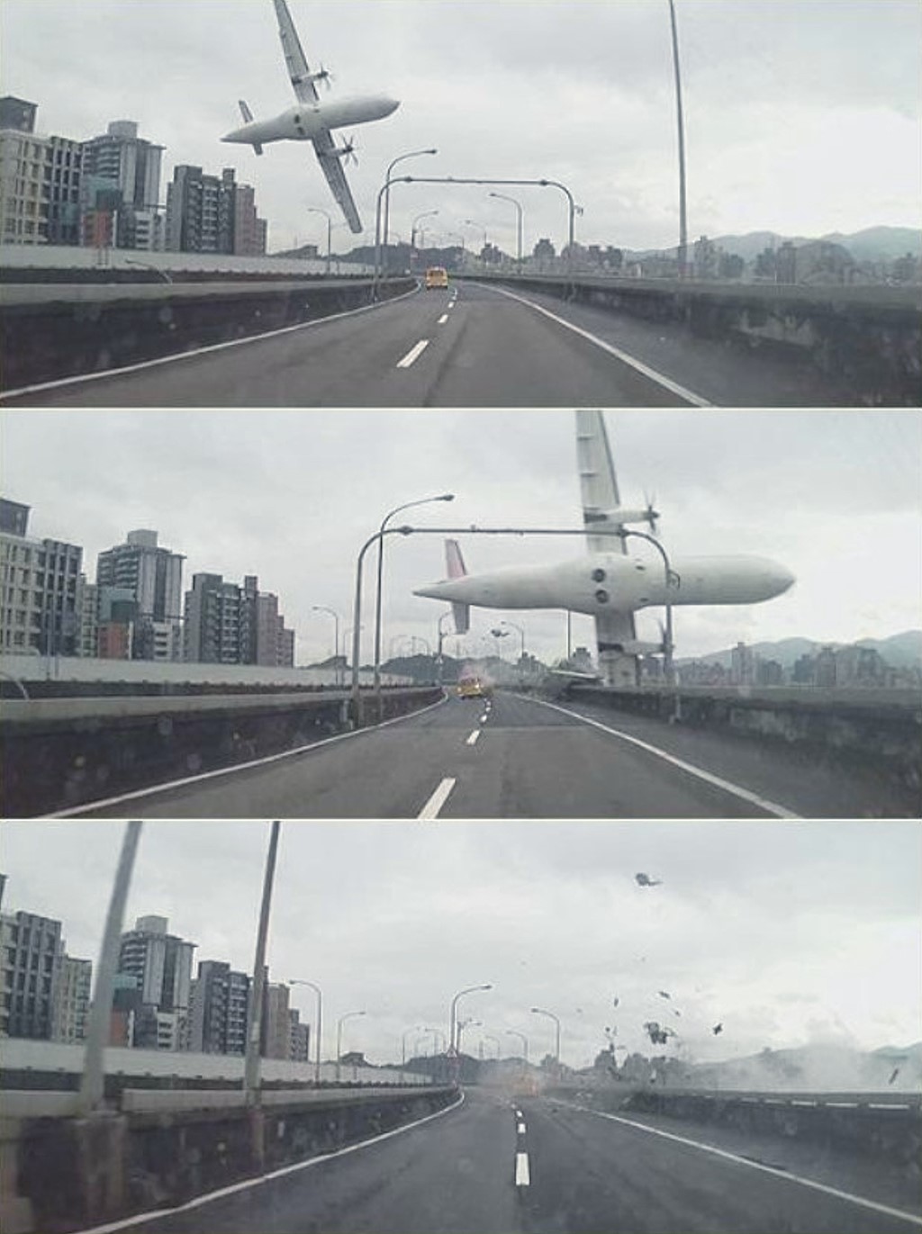 4 février 2015, 2minutes 40 secondes de vol seulement pour un ATR 72 avant de s'écraser dans la rivière Keelung à Taïpeï. Le vol 235 de TransAsia décolle avec 53 passagers et 5 membres d'équipage à destination de l'ile de Kinmen. En pleine ascension, le moteur droit tombe en panne. L'équipage applique aussitôt la procédure prévue de redémarrage mais se trompe de moteur et coupe le moteur gauche.