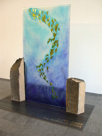 Une sculpture de verre et de pierre mesurant 2 m de haut