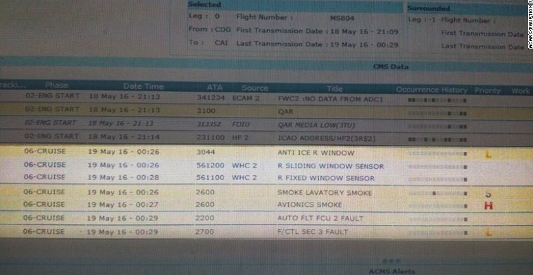 Selon une source proche du dossier, plusieurs messages d'alarme envoyés par le système automatisé de communication (Acars) de l'Airbus, dont certains indiquant la présence de fumée, auraient été reçus par le centre de maintenance d'EgyptAir avant l'arrivée de l'appareil à Paris. "Les premières investigations ont confirmé l'existence sur cet avion de défauts techniques lors des vols qui ont précédé, le 18 mai, le Paris - Le Caire, et dont EgyptAir devait avoir connaissance", affirme Me Sébastien Busy, avocat de 19 familles de victimes – dont 14 françaises – et de la Fédération nationale des victimes d'attentats et d'accidents collectifs (Fenvac).
