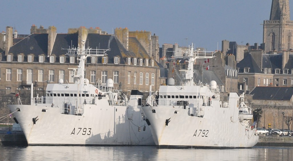 L'A793 "Laplace" un des cinq bâtiments hydro-océaniques de la Marine Française. Ici à quai avec le "Borda"