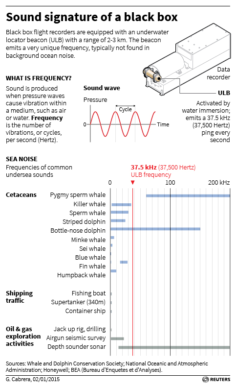 Les enregistreurs de vol sont équipés d'une balise ULB  (Underwater Locator Beacon) qui émet un signal sous-marin sur la fréquence de 37,5 kHz, en fait, un "ping" toutes les secondes. Sa portée est comprise entre 2000m et 3000m selon les conditions de propagation et la sensibilité des récepteurs. Cette fréquence de 37,5 kHz a été choisie car elle est distincte de la plupart des bruits de fond aquatiques et en particulier des sons émis par les cétacés.