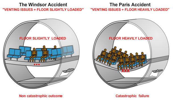 Le nombre et donc le poids des passagers (+ 7t) a fragilisé le plancher de la zone arrière et accentué sa flexion en aggravant les dégâts sur la structure, les chemins de câbles et les circuits hydrauliques.