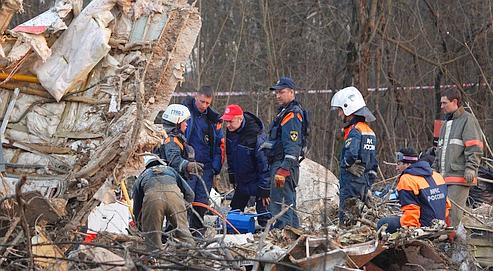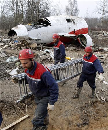 L'épave du Tu-154 et les enquêteurs russo-polonais. |