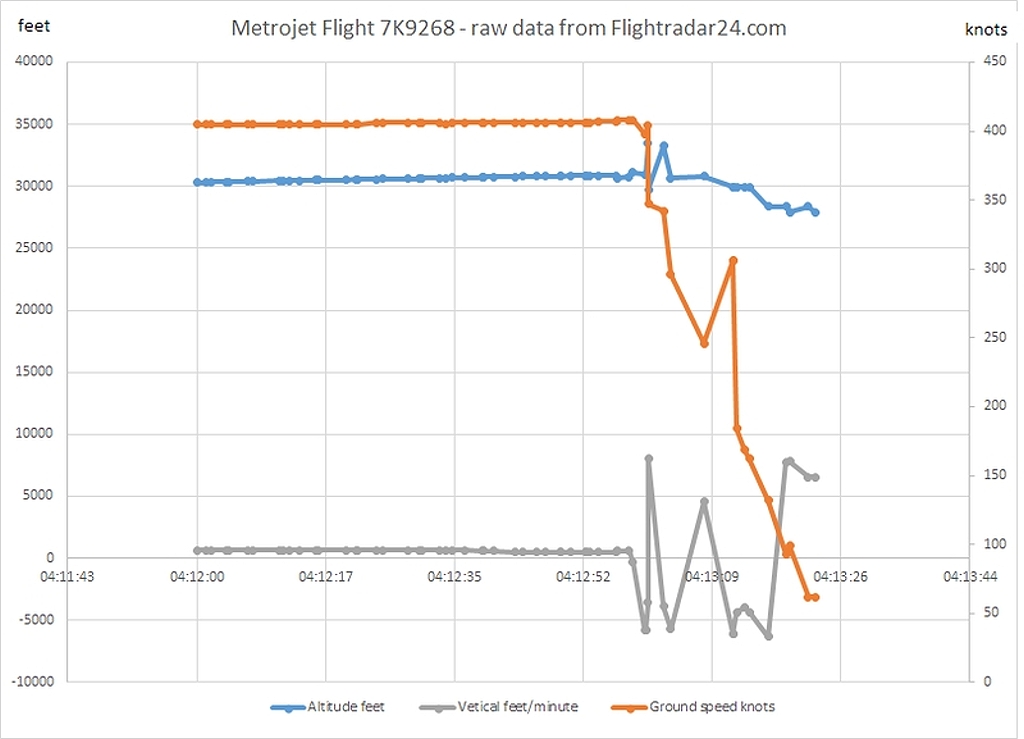 erratiques de l'avion alors que la vitesse (orange) chute dans le
